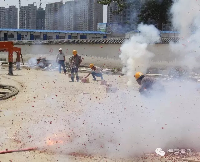 施工方以及君瑞城工程部人員燃放鞭炮慶祝金日封頂