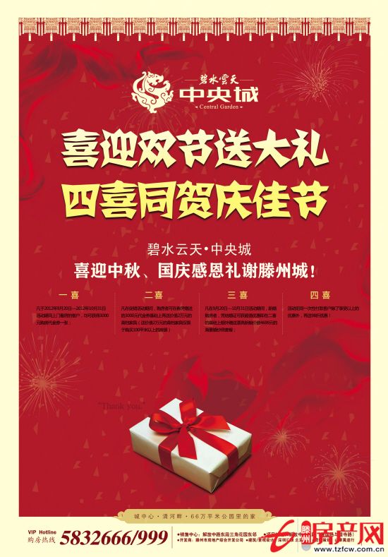 喜迎雙節送大禮四喜同賀慶佳節碧水云天·中央城喜迎中秋、國慶感恩禮謝滕州城銷售中心:解放中路東段三角花園東鄰購房熱線:5832666/5832999...