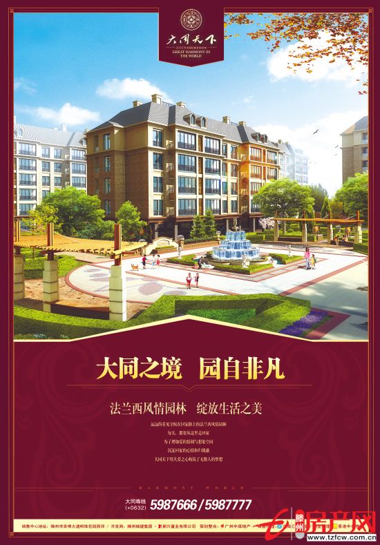 法蘭西風情園林綻放生活之美增加愛的情調與想象空間沉淀回家的心情和歸屬感大同天下用大愛之心構筑了無數人的夢想大同尊線:0632-5987666/5987777銷售中心地址:滕州市青啤大道明珠花園西鄰...