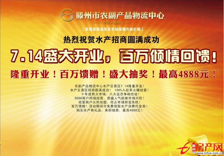 滕州市農副產品物流中心【水產交易區】7月14日隆重開業百萬傾情回饋!經營商戶火熱加盟搶占市場財富先機獨立產權多種鋪型活動期間可免費領取水產消費代金券購買水產即有豪禮相送來即抽獎最高4888元!開發公司:滕州市農副產品物流中心有限公司售樓地址...