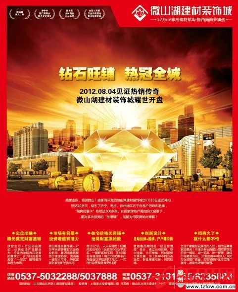 微山湖建材裝飾城——鉆石旺鋪,熱冠全城,8月4日盛大開盤!銷售熱線:0537-50322885037888項目地址:微山縣北環路(鹿鳴新城北側)...