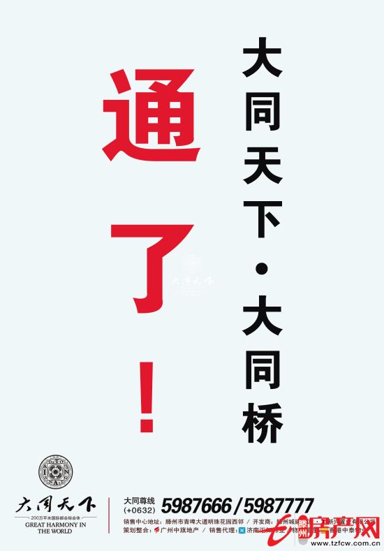 大同天下·大同橋通車了!大同天下到火車站僅一座橋的距離大同橋的開通,一個200萬平方米國際都會綜合體改變了這里的生活形態商業模式和消費模式更改變城市的格局和風貌大同尊線:0632-5987666/5987777銷售中心:滕州市青啤大道明珠花...