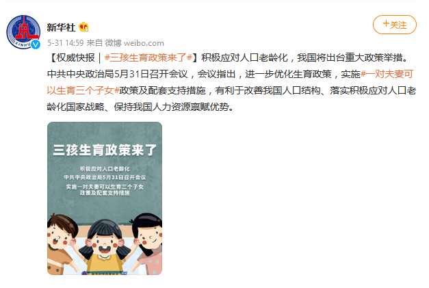 最近最為熱門的話題莫過于生育政策調整了。5月31日,中央政治局召開會議,聽取了“十四五”時期積極應對人口老齡化重大政策舉措匯報,審議了《關于優化生育政策促進人口長期均衡發展的決定》,提出進一步優化生育政策,實施一對夫妻可以生育三個子女政策及...