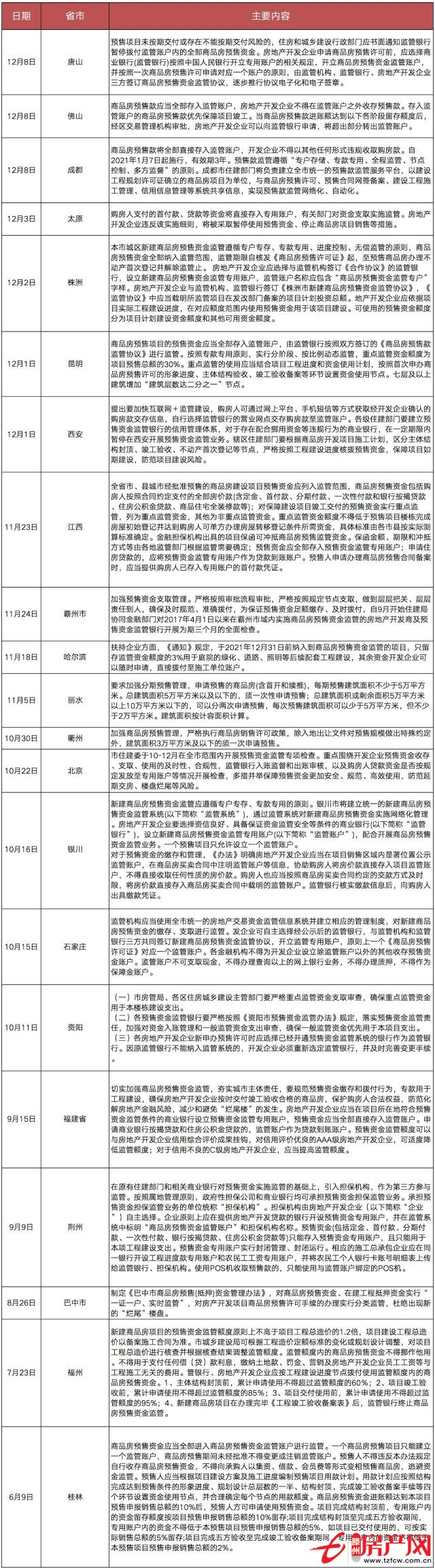 臨近年末,商品房預售資金監管再度被收緊,并逐漸形成一種趨勢性政策。12月僅過半,就有成都、唐山等7城發布商品房預售資金監管辦法。加強預售資金監管極具信號意義,能夠保障項目資金運轉的安全性,防范房地產領域的金融風險,同時減少因企業資金挪用而產...