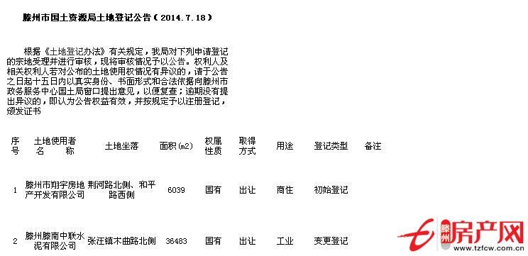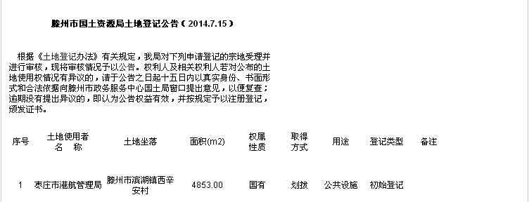 根據《土地登記辦法》有關規定,我局對下列申請登記的宗地受理并進行審核,現將審核情況予以公告。權利人及相關權利人若對公布的土地使用權情況有異議的,請于公告之日起十五日內以真實身份、書面形式和合法依據向滕州市政務服務中心國土局窗口提出意見,以便...