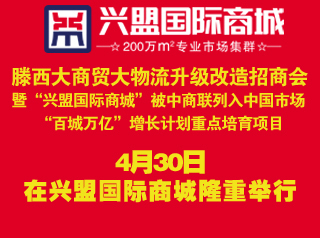 熱烈祝賀滕西大商貿大物流升級改造招商會4月30日在興盟國際商城舉行。滕州興盟國際商城是山東省重點產業項目,滕州市10大重點項目之一,總投資金額超百億元鼎力打造的超大型專業市場集群。占地面積2000畝,總建筑面積200萬平方米,集物資建材市場...